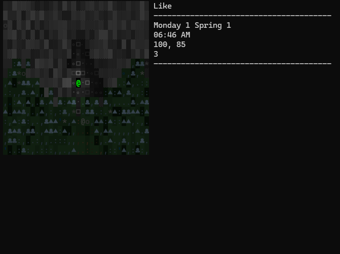 The player character is also casting a light around them which is more obvious in the dark and can be used to simulate a torch nicely when the radius is increased. Any tile more then a step or two outside this range is dimmed progressively darker the further from the player. This effect is barely noticeable during the day but ramps up to almost no visibility at night without a torch equipped.